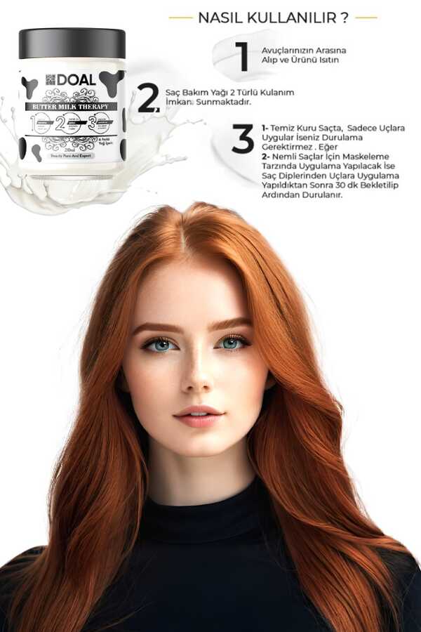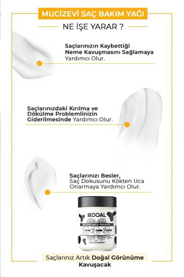 Doal Milk Therapy Butter Mucizevi Saç Bakım Kürü Tüm saç tipleri için özel olarak formüle edilmiş Doal Milk Therapy Butter Yağ İçeren Mucizevi Saç Bakım Kürü, saçlarınızı kökten uca besler, onarır ve yeniden yapılandırır. Saçlarınızın kaybettiği neme kavuşmasını sağlarken, doğal yağ dengesini korur. Doal Milk Therapy Butter Mucizevi Saç Bakım Kürü Etkileri Saçlarınızı besler, saç dokusunu kökten uca onarır. Kırılma ve dökülme problemlerinizin giderilmesine yardımcı olur. Saç derisini iyileştirerek kepeklenme gibi sorunlarınızın kontrol altına alınmasına destek verir. Aşırı ve çabuk yağlanma probleminin azalmasına yardımcı olur. Elektriklenmeyi önler. Saçların kolayca taranmasını sağlar. Doğal saç renginizin korunmasına katkı sunar. İçeriğindeki keratin ile saçlarınızı onarır, sağlıklı ve dolgun bir görünüm verir. Doal Milk Therapy Butter Mucizevi Saç Bakım Kürü Nasıl Kullanılır? Temiz ve kuru saçlarda: Bir miktar Doal Milk Therapy Butter Yağ İçeren Mucizevi Saç Bakım Kürünü avuçlarınızın arasında ısıtın ve saç uçlarına uygulayın. Durulama işlemine gerek kalmaksızın saçlarınızı şekillendirin. Nemli saçlarda: Saç diplerinden uçlara doğru masaj yaparak uygulayın. Ardından en az 30 dakika bekleyin ve saçlarınızı durulayın. Kadın ve erkek için kullanıma uygundur. İlk kullanımdan itibaren saçlarınızdaki gözle görülür değişimi hissedebilirsiniz.