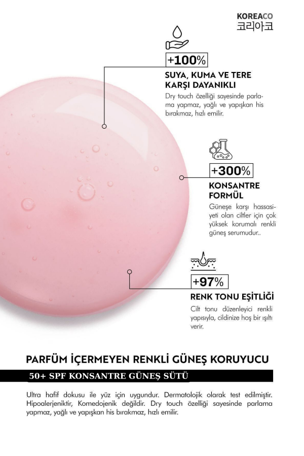 Cildi güneşin zararlı UVA ve UVB ışınlarına karşı yüksek düzeyde korurken, pembe ton eşitleyici yapısıyla daha canlı, aydınlık ve dengeli bir cilt görünümü sunar.